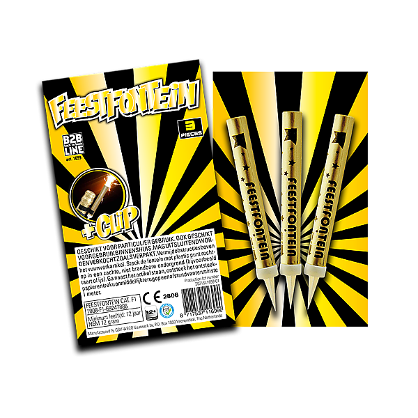 B2B Feestfontein. Drie stuks Feestfonteinen/IJsfonteinen op een blister. Super handig, nu inclusief fleshalshouder! Perfect om de feestfontein op uw fles champagne te zetten!