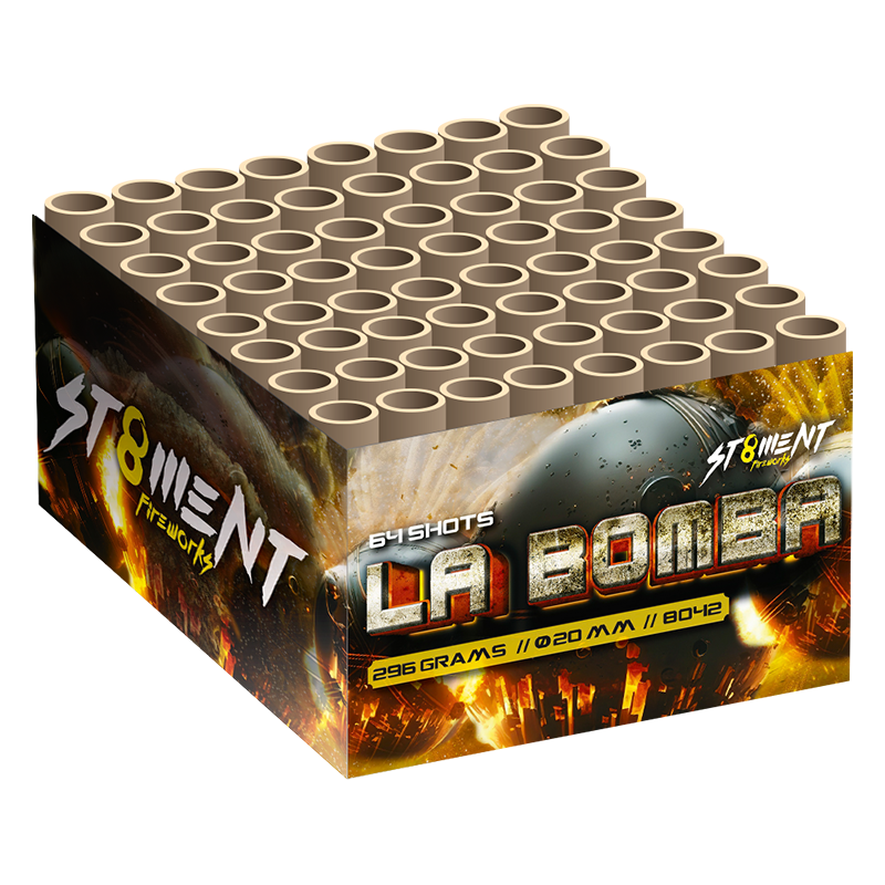 La Bomba! Knallend en fluitend het nieuwe jaar in? Dan is deze La Bomba-cake jouw perfecte keuze! Gebaseerd op de oude Estallar van St8ment schiet deze cake 64 schoten in heftige salvos van siervuurwerk en fluit in een hoog tempo de hemel in! Topper van de bovenste plank! n nProductinformatie: nType product: Siervuurwerk nEffect product: Cake nTube diameter: 20mm nFanshape: Nee nClassificatie: CAT.F2 nMinimale leeftijd: 16 jaar nLegaal afsteken op: 31 december nVeiligheidsafstand: minimaal 8 meter nGeschikt voor smalle straten: Ja nGeschikt in Gemeente vuurwerkverbod: Nee La Bomba 64 shots 20mm Goedkoop vuurwerk kopen bij Vuurwerkwinkel Assen