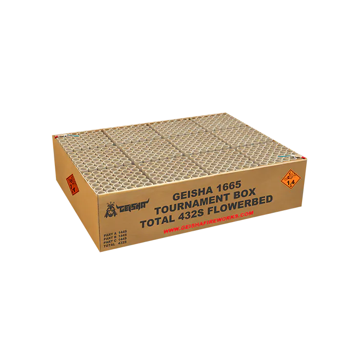 TOURNAMENT BOX 432’S 1/2/3 COMBIDEAL nProfessioneel flowerbed! 432 shots lang geniet jij van het gruwelijkste en heftigste vuurwerk te koop op de Nederlandse markt! In 2019 verkozen tot beste cakebox vanaf 2KG! Deze box bestaat uit drie compoundelen, in totaal 432 schoten. n