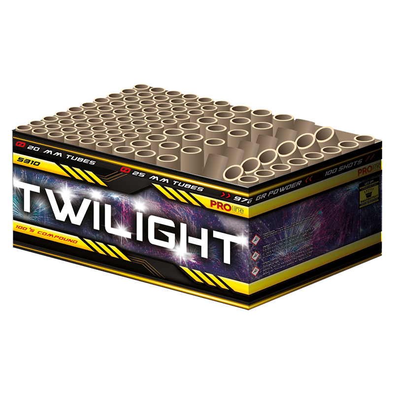 Pro-line Fireworks Twilight, 100 shots, 20+25mm compound. Gekleurde peony met snow-style crackling, gouden salvos met ghost-effecten, fan/z-shape effecten en double gold en enkel goud effecten vormen een ultieme opbouw van begin tot eind.