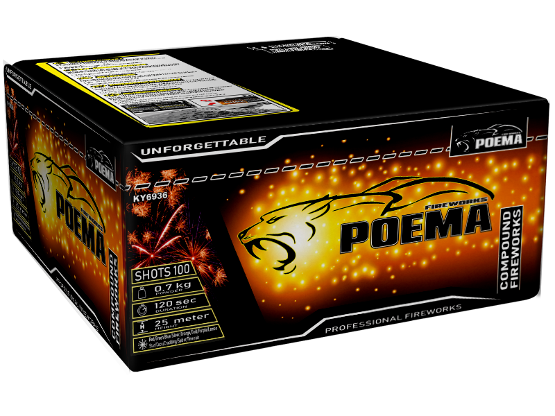 Unforgettable nNieuwe compound cake uit de Poema serie met 100 shots. n nKruitgewicht 700 Gram nTube diameter 20 nBrandtijd 80 Seconden nHoogte 20 m. – 25 m. n