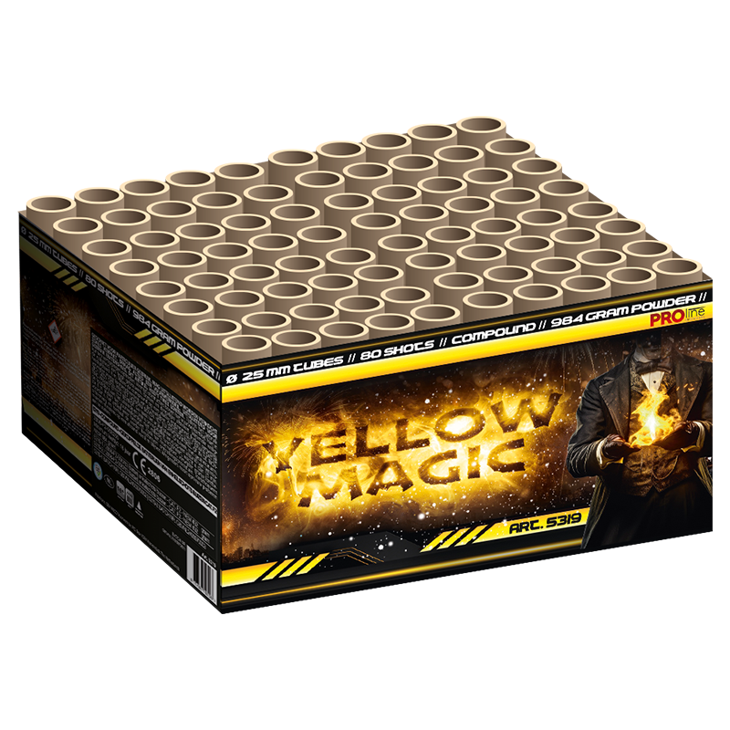 Yellow Magic, 80 shots 25mm compound. Prachtige gouden willow palmen, knetter spider/dahlia, brocade crowns met gekleurde toppen en blinkers, gevolgd door een spectaculaire willow to moving stars finale! n nProductinformatie: nType product: Siervuurwerk nEffect product: Compound nTube diameter: 25mm nFanshape: Ja nClassificatie: CAT.F2 nMinimale leeftijd: 16 jaar nLegaal afsteken op: 31 december nVeiligheidsafstand: minimaal 8 meter nGeschikt voor smalle straten: Nee nGeschikt in Gemeente vuurwerkverbod: Nee Yellow Magic 80 shots 25mm Goedkoop vuurwerk kopen bij Vuurwerkwinkel Assen